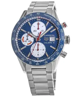 Brand New Authentic Tag Heuer Carrera Chronograph Day-Date Automatic Black Dial Steel Men's Fashion Watch Model CBN2A1AA.BA0643. Brushed and Polished Stainless Steel case, Brushed and Polished Stainless Steel folding band with clasp, Luminous Silver Tone hands and stick hour markers on a Black dial; minute markers around outer rim, 3 sub-dials present, Swiss Automatic Chronograph movement Calibre 16 powering the watch, features include Date at 3 o'clock, Day of Week display, 80 hours power reserve, Hour/Minute/Second indicators via central chronograph hands and dials, Tachymeter scale on bezel, Scratch Resistant Sapphire crystal, Round case shape measuring 44mm diameter and 15.27mm thickness, Transparent screw-back, Water resistant up to 100 meters (330 feet), Comes with WatchMaxx warranty.
